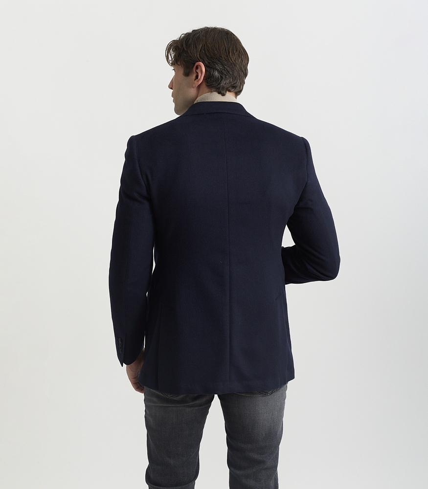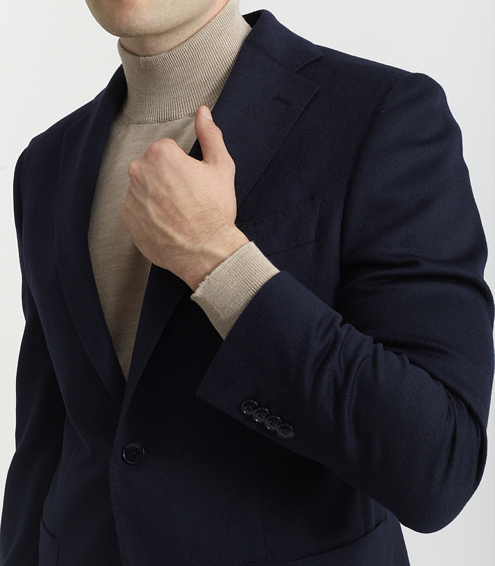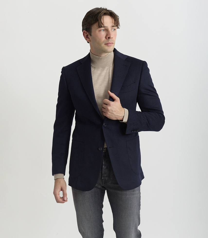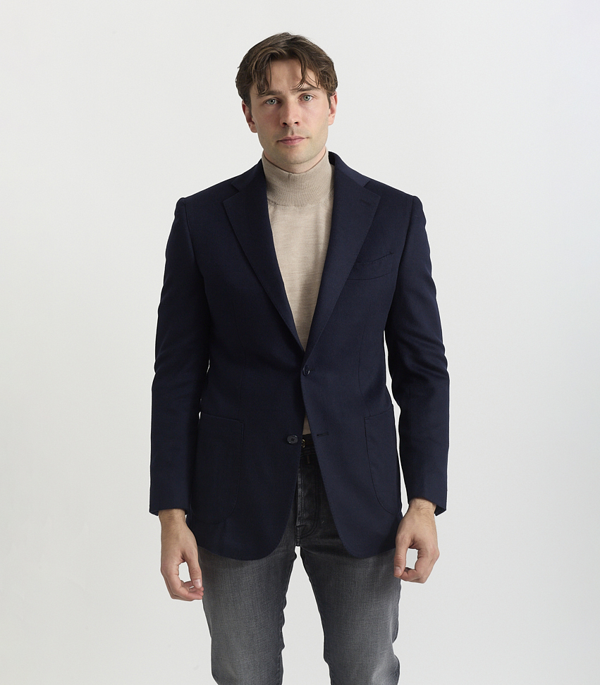 Der exklusive Stoff fällt besonders geschmeidig und verleiht dem Sakko eine elegante, fließende Silhouette. Dank der charaktervollen, leicht natürlichen Struktur wirkt das Material lebendig und raffiniert, ohne dabei an Understatement zu verlieren.