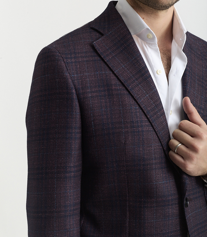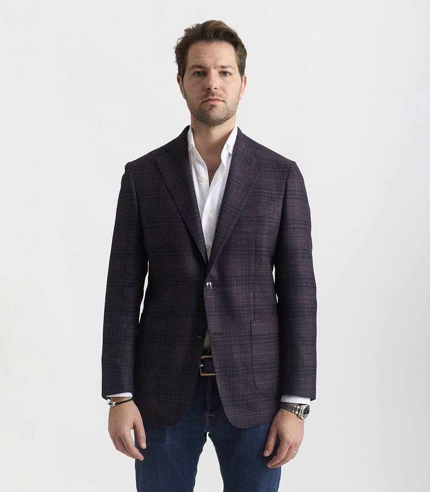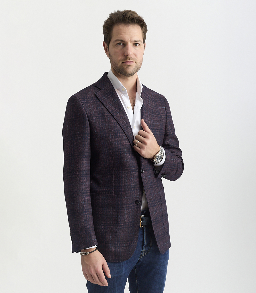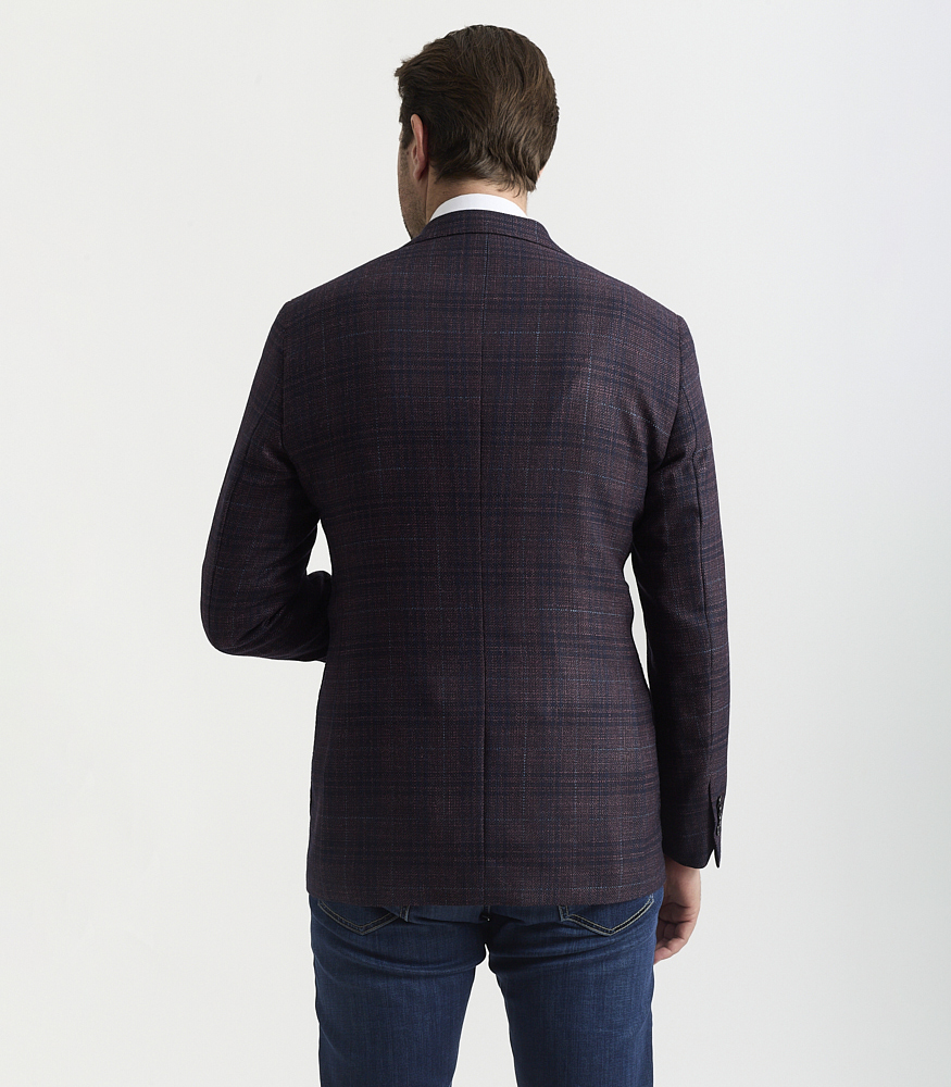 Das fein abgestimmte Karomuster verleiht dem Sakko eine klassische, doch moderne Ausstrahlung. Die strukturierte Optik sorgt für Tiefe und Raffinesse, ohne aufdringlich zu wirken.