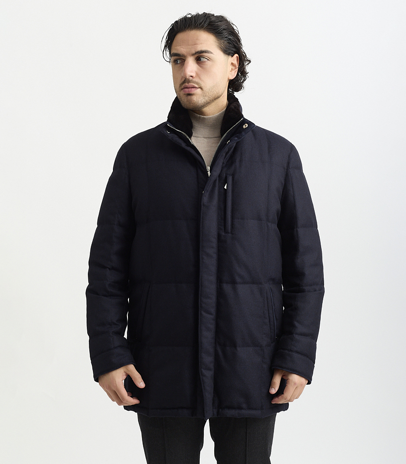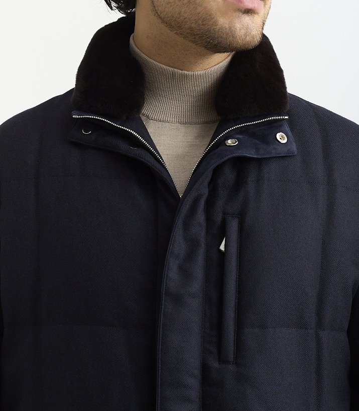 Diese luxuriöse Mandelli-Jacke kombiniert zeitlose Eleganz mit feinster Handwerkskunst. Der edle Woll-Kaschmir-Mix sorgt für außergewöhnliche Weichheit, angenehme Wärme und eine natürliche, fließende Struktur. Ein üppiger Merzfellkragen verleiht dem Modell eine exklusive, winterliche Note und setzt einen markanten Akzent, der sowohl stilvoll als auch funktional ist. Fein platzierte Wildlederdetails unterstreichen die handwerkliche Raffinesse der Jacke und verleihen ihr einen dezenten Kontrast sowie zusätzliche Tiefe im Design.